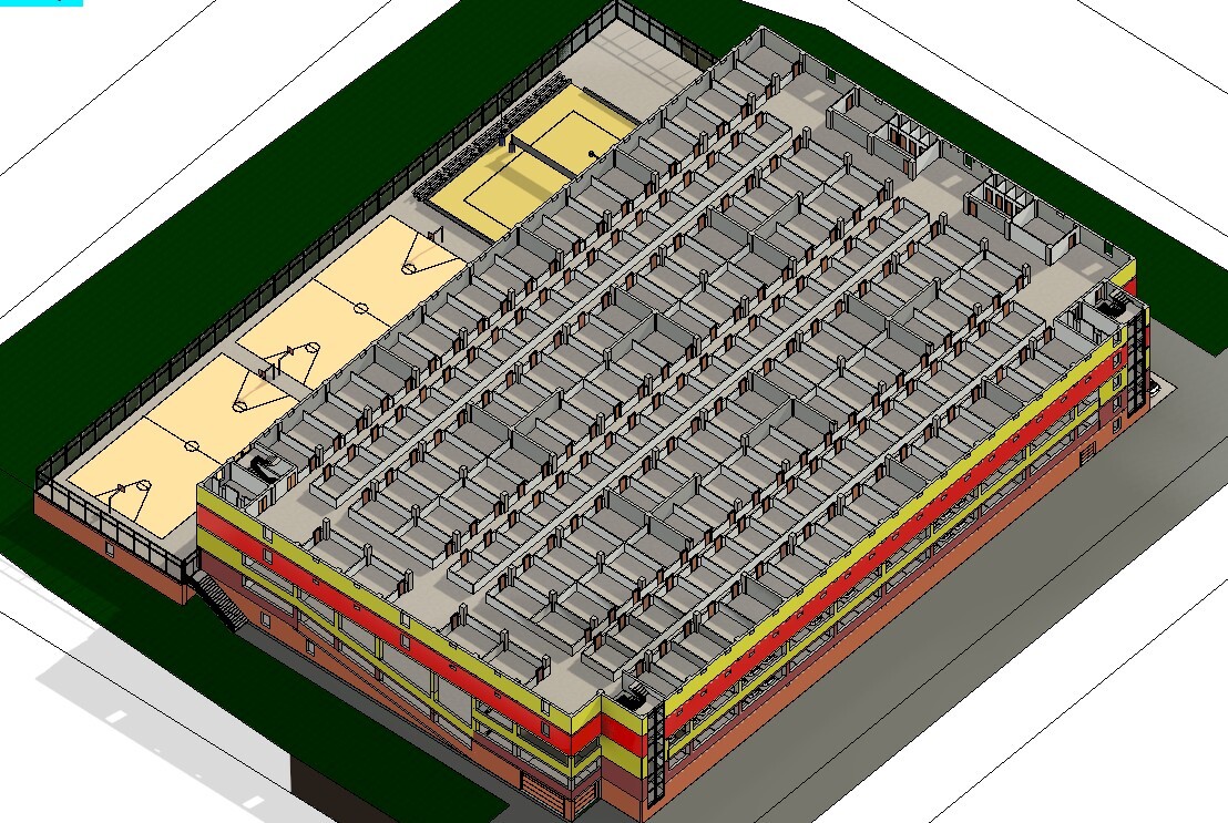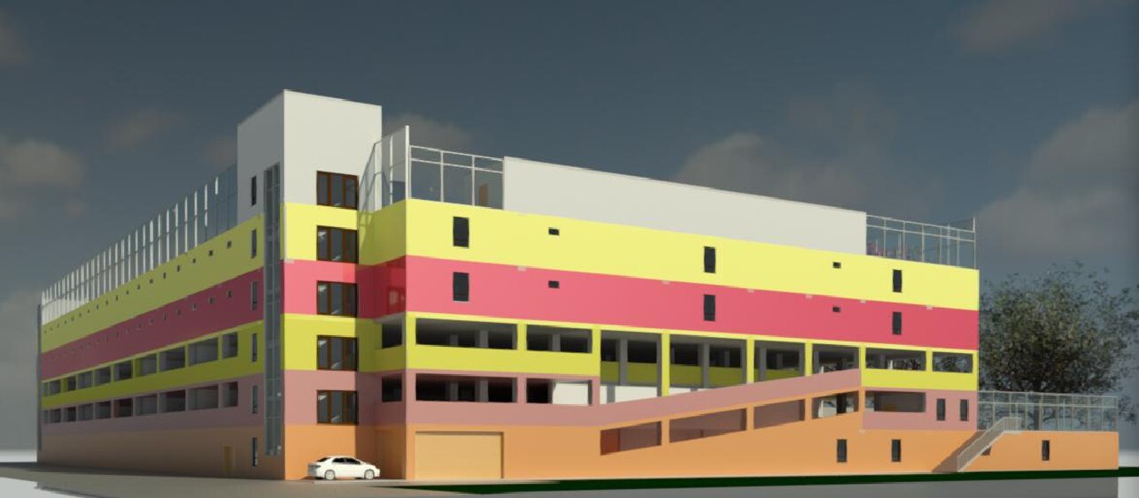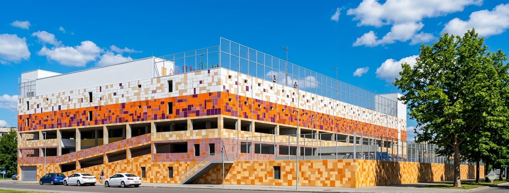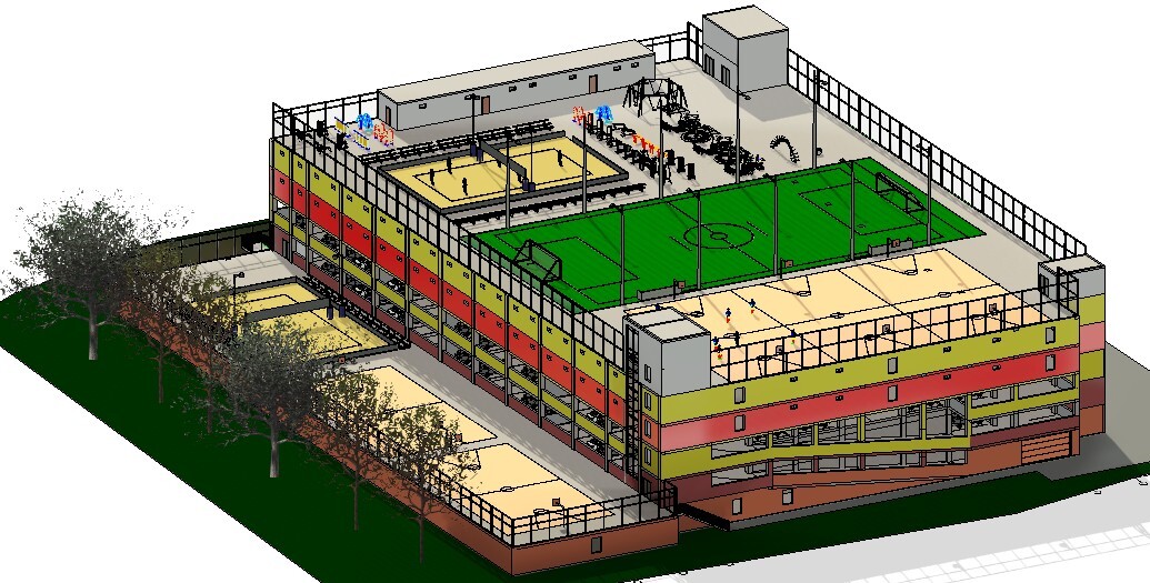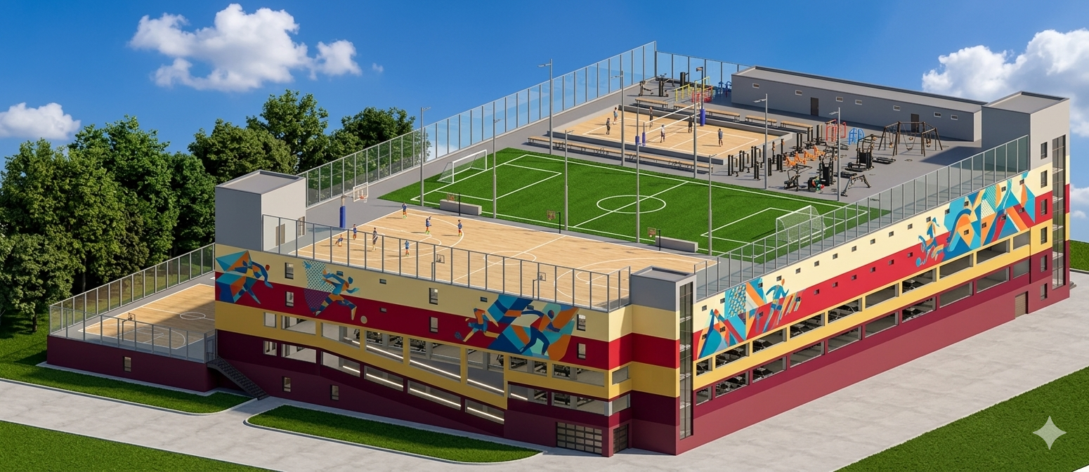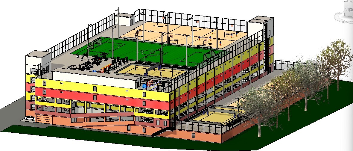 Многофункциональный центр с парковочными местами на 336 автомобилей и спортивными площадками.